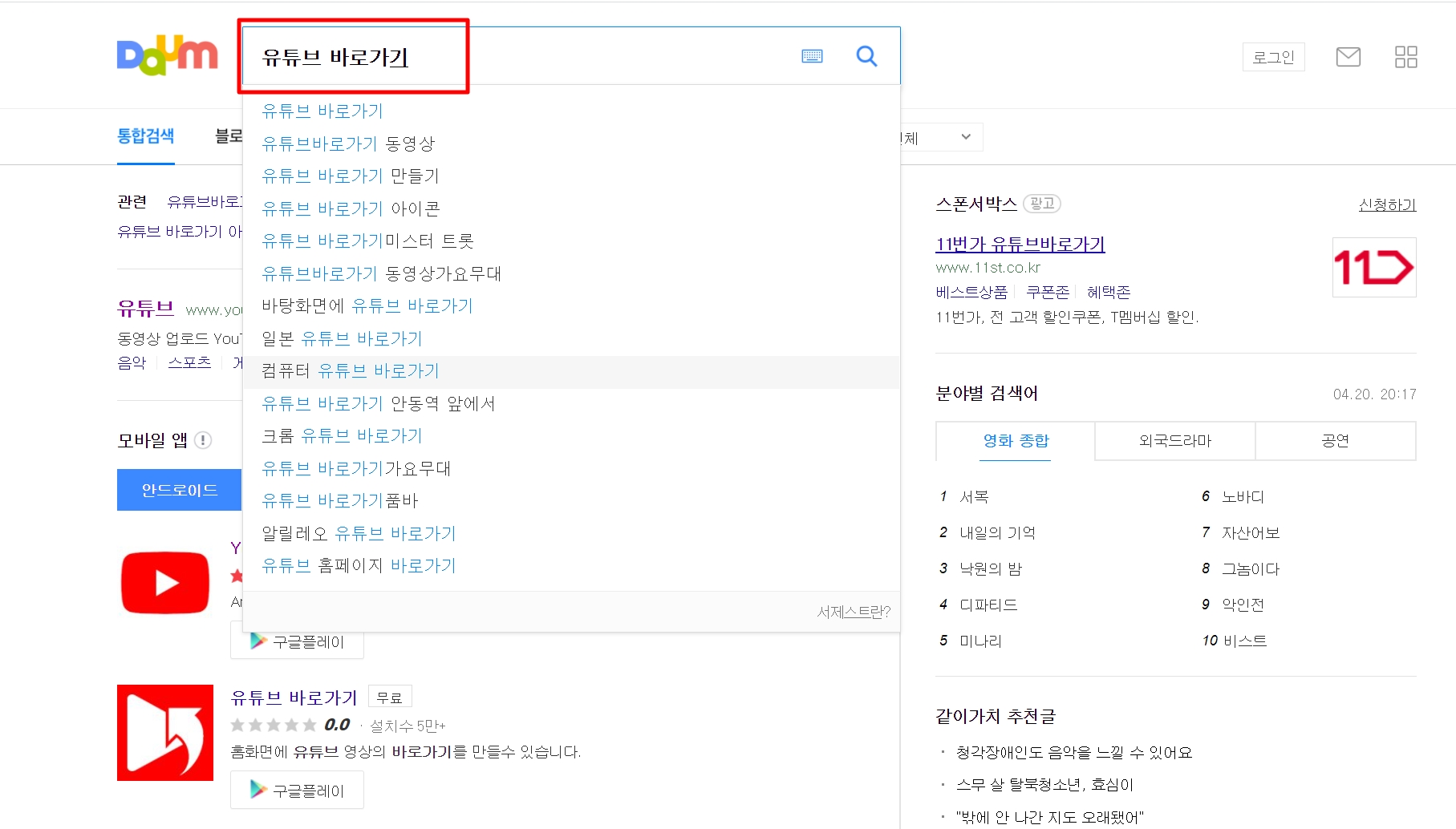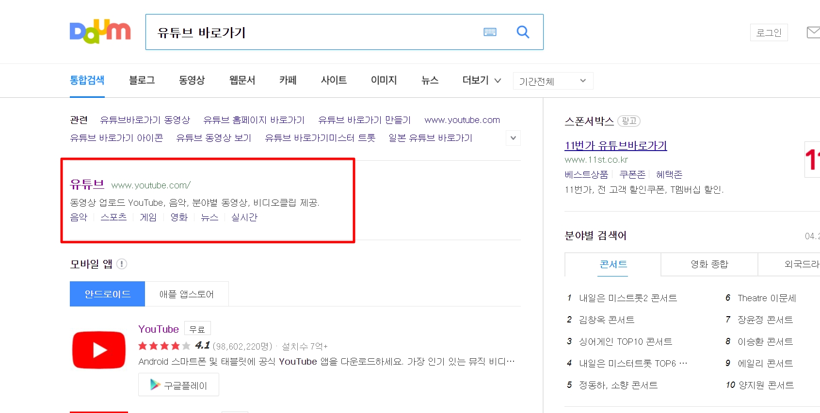 1. 다음(daum)검색창에 "유튜브 바로가기"를 검색합니다.