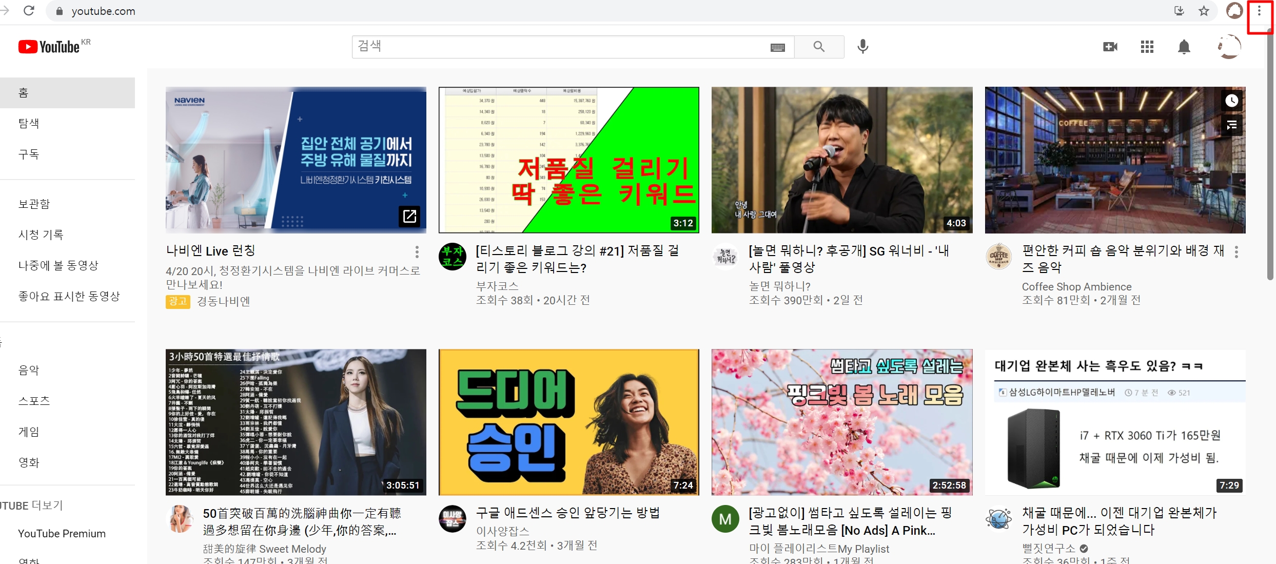 3. "유튜브" 사이트에 접속하여 오른쪽 상단에 보시면 "점 3개"를 클릭합니다.