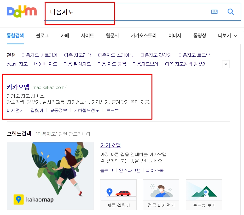 1. 다음(daum)검색창에 "다음지도"를 검색합니다. 그리고 "다음지도" 검색으로 나온 "카카오맵" 사이트를 클릭하여 들어갑니다.