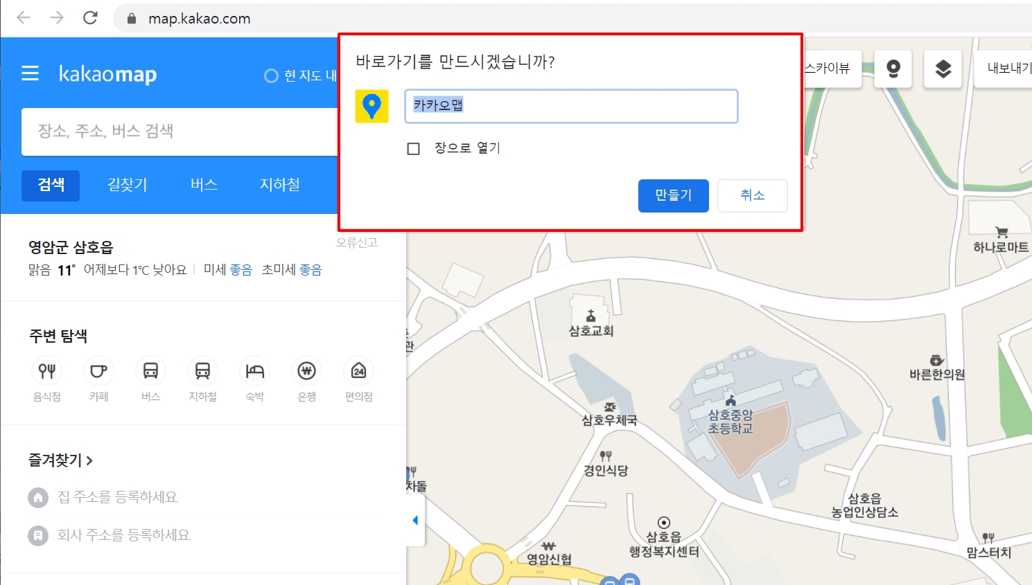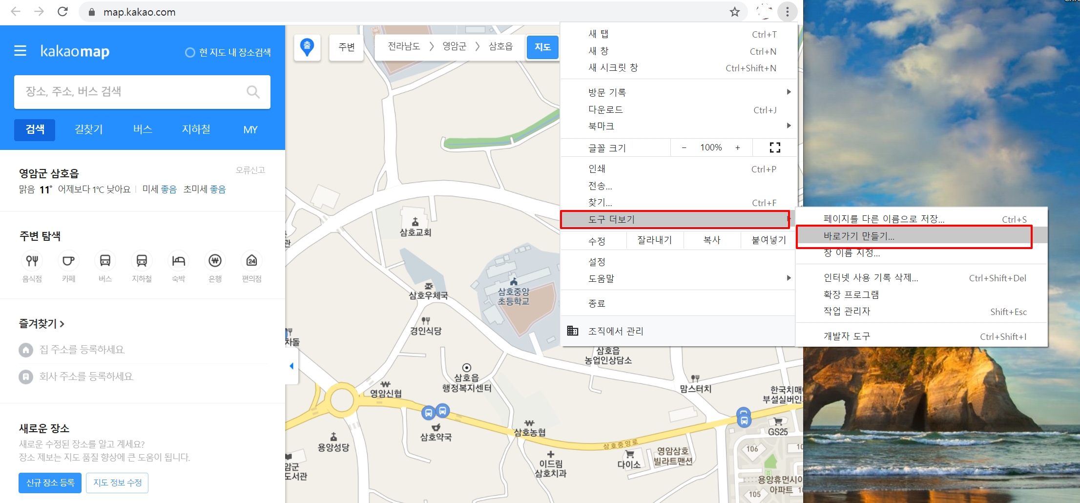 5. 바탕화면에 "카카오맵" 아이콘이 뜹니다. 아이콘만 클릭하시면 다음지도에 바로 접속하셔서 지도검색, 길찾기, 스카이뷰 등을 손쉽게 이용하실 수 있습니다.