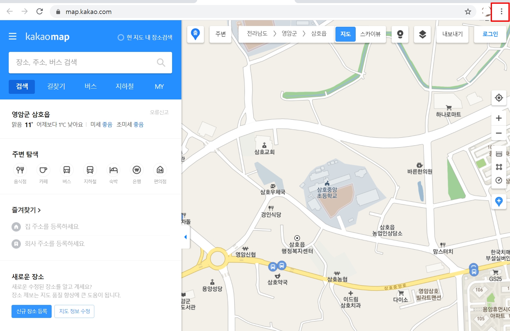 2. "카카오맵" 사이트에 접속하여 오른쪽 상단에 보시면 "점 3개"를 클릭합니다.