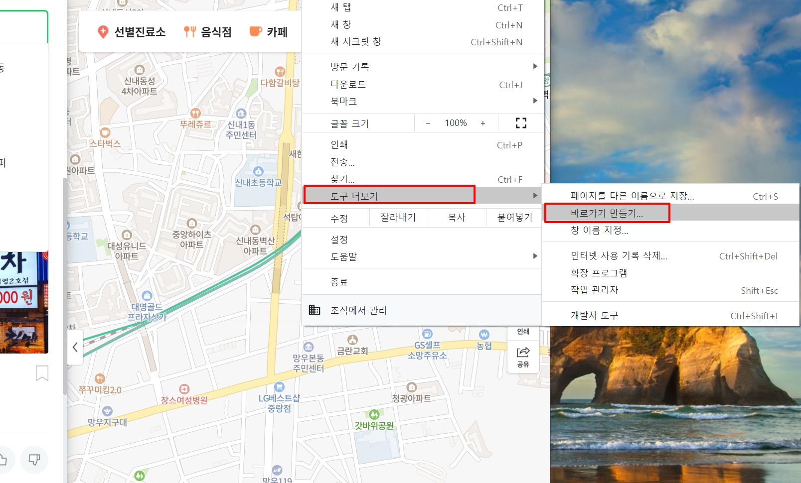 4. "도구 더보기" - "바로가기 만들기"를 클릭합니다.
