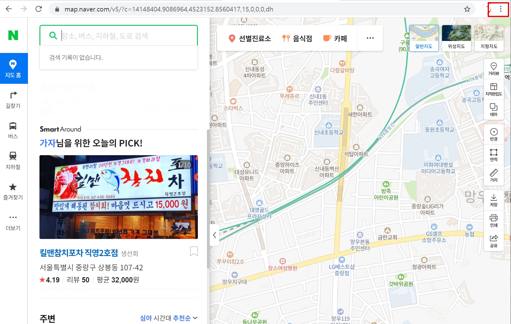3. "네이버지도" 사이트에 접속하여 오른쪽 상단에 보시면 "점 3개"를 클릭합니다.