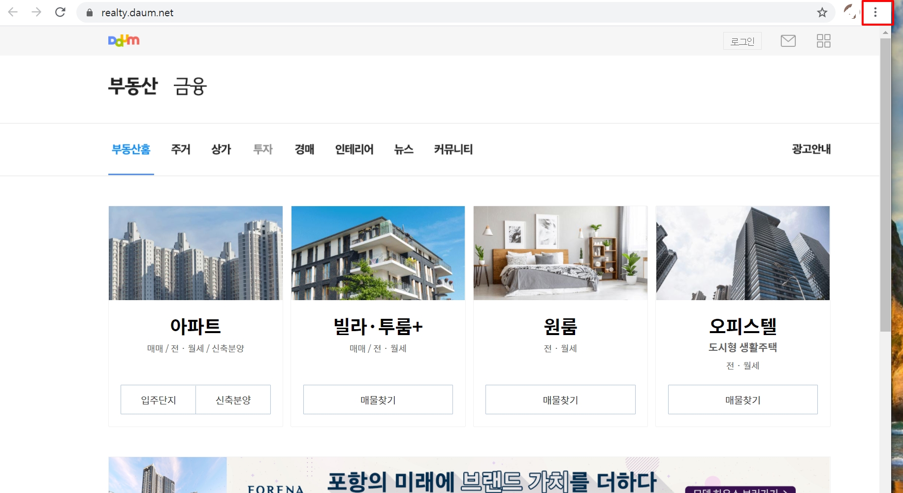 3. "다음부동산" 사이트에 접속하여 오른쪽 상단에 보시면 "점 3개"를 클릭합니다.
