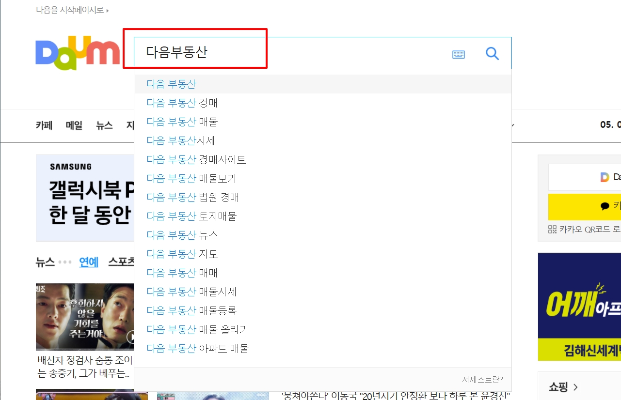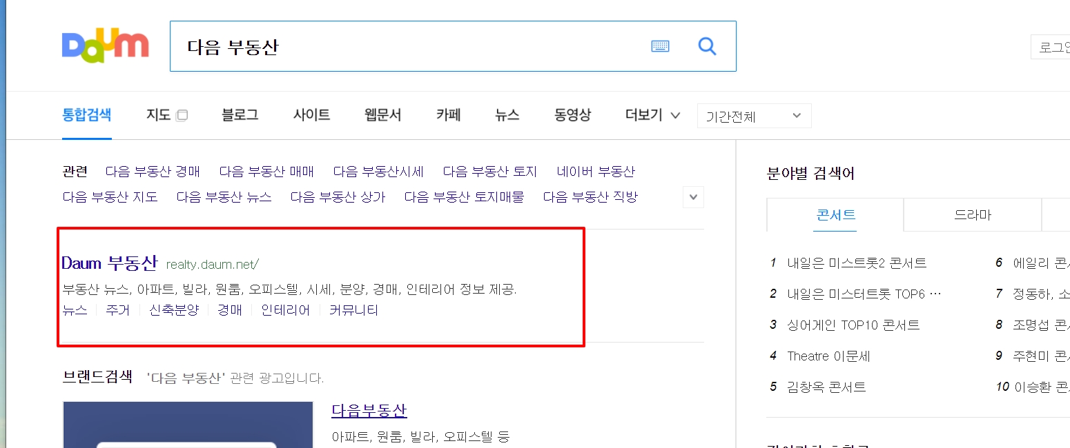 1. 다음(daum)검색창에 "다음부동산 바로가기"를 검색합니다.