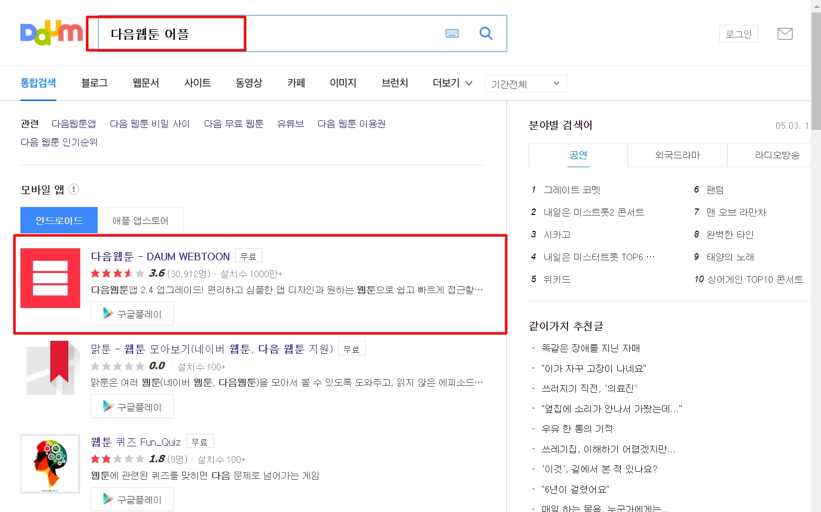 다음웹툰 어플 검색하시면 아래와 같이 다음웹툰 어플이 뜹니다. 또 다른 방법으로는 구글에서 다음웹툰 검색하시면 아래와 같은 어플이 나오면 다운로드하시면 됩니다.