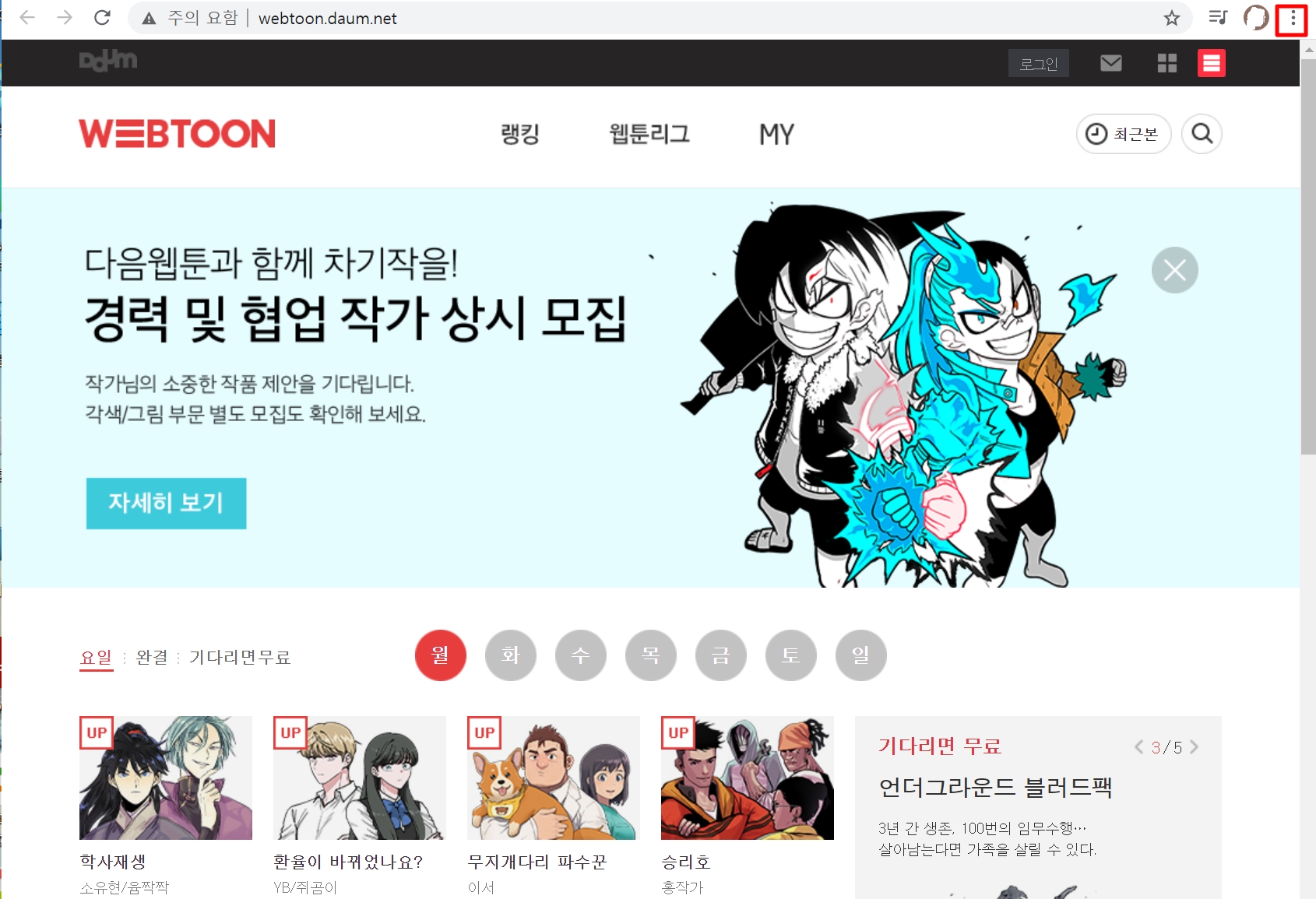 3. "다음웹툰" 사이트에 접속하여 오른쪽 상단에 보시면 "점 3개"를 클릭합니다.