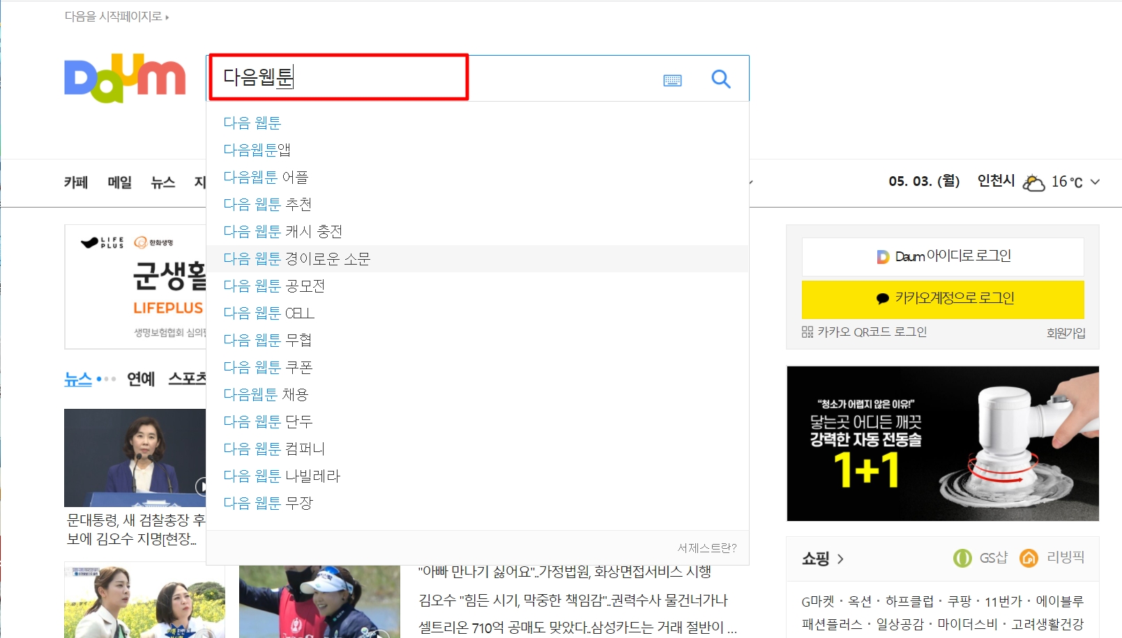 1. 다음(daum)검색창에 "다음웹툰"를 검색합니다.