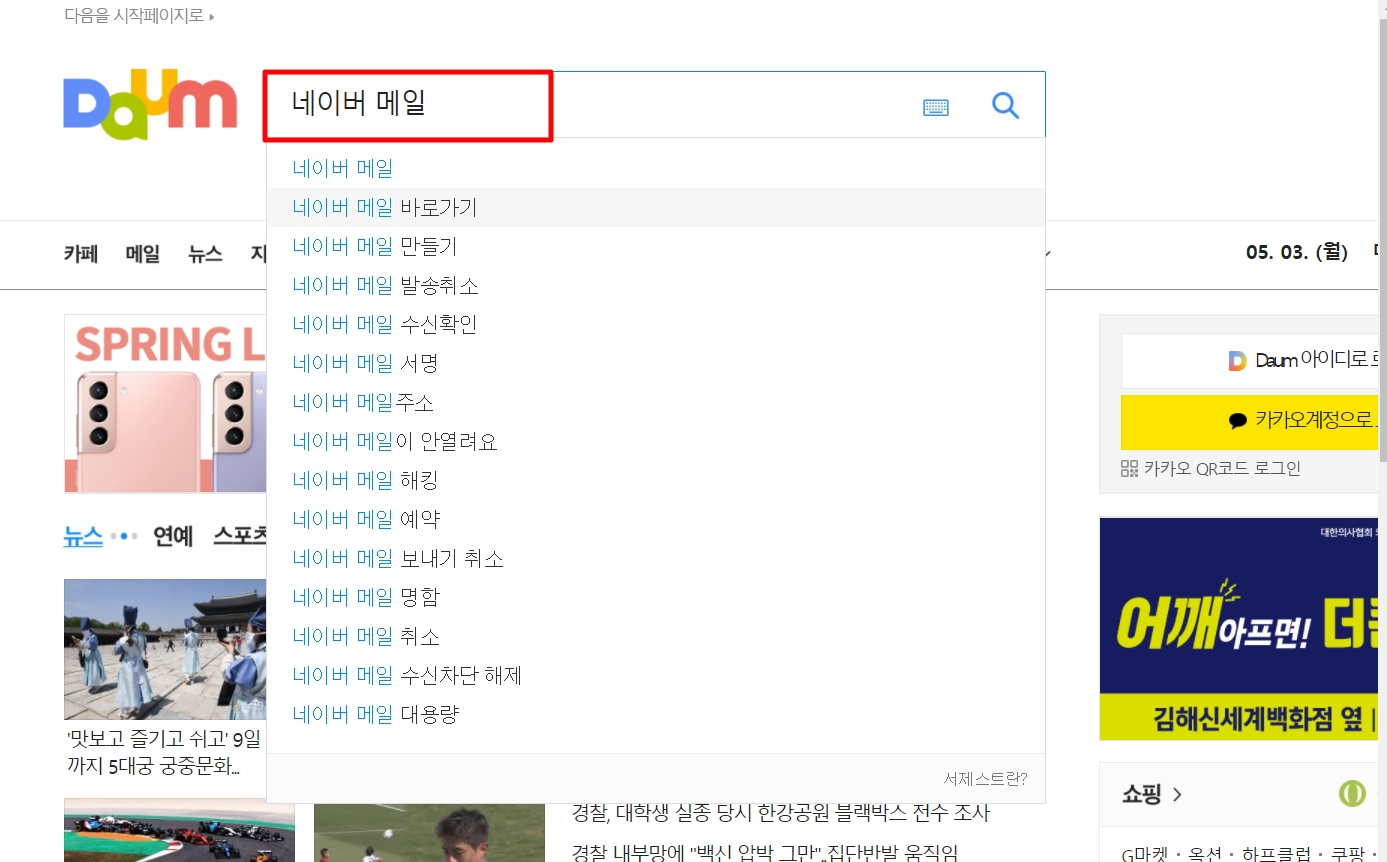 1. 다음(daum)검색창에 "네이버 메일"을 검색합니다.