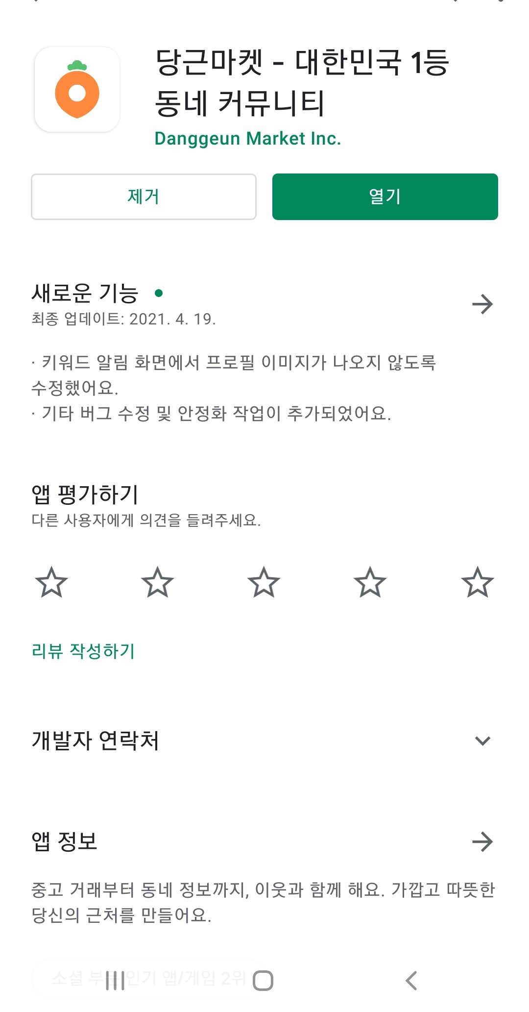 대한민국 중고거래, 소상공인 홍보 등 생활정보 소프트웨어이다. 중고거래, 지역업체, 질문 답변, 부동산, 구인구직 등 지역 내에서 발생하는 생활정보를 검색하고 게시자와 실시간으로 채팅할 수 있습니다. 당근마켓 서비스 이용자 수가 급증했으며, 중고거래 앱 관심도 설문조사에서 중고나라보다 당근마켓에 더 높은 관심도를 보였습니다.