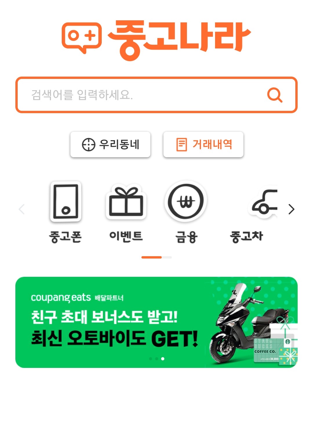 3. 어플을 다운로드 후, 중고나라 어플을 실행하시면 중고물품 거래를 이용하실 수 있습니다.