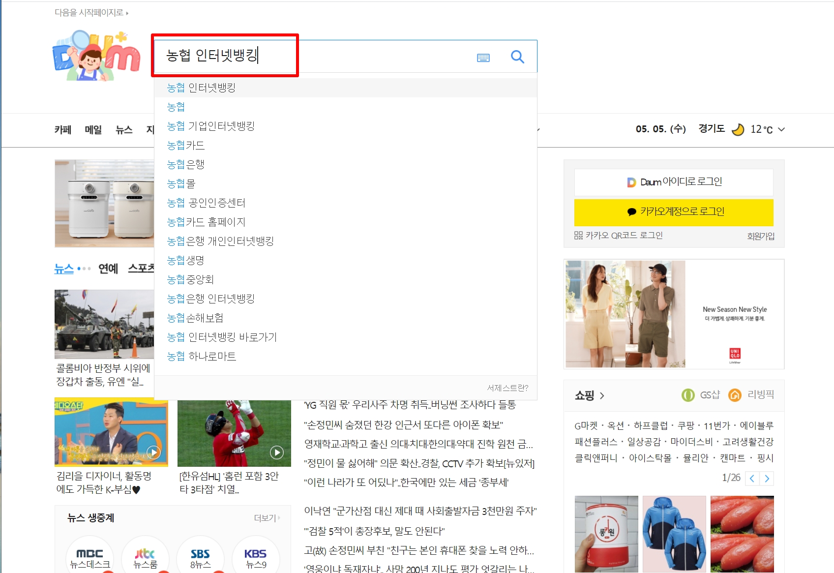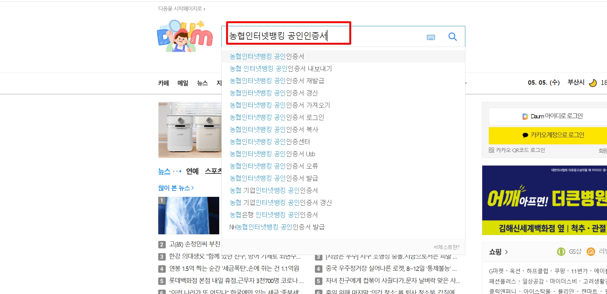 1. 다음(daum)검색창에 "농협 인터넷뱅킹 공인인증서"를 검색합니다.