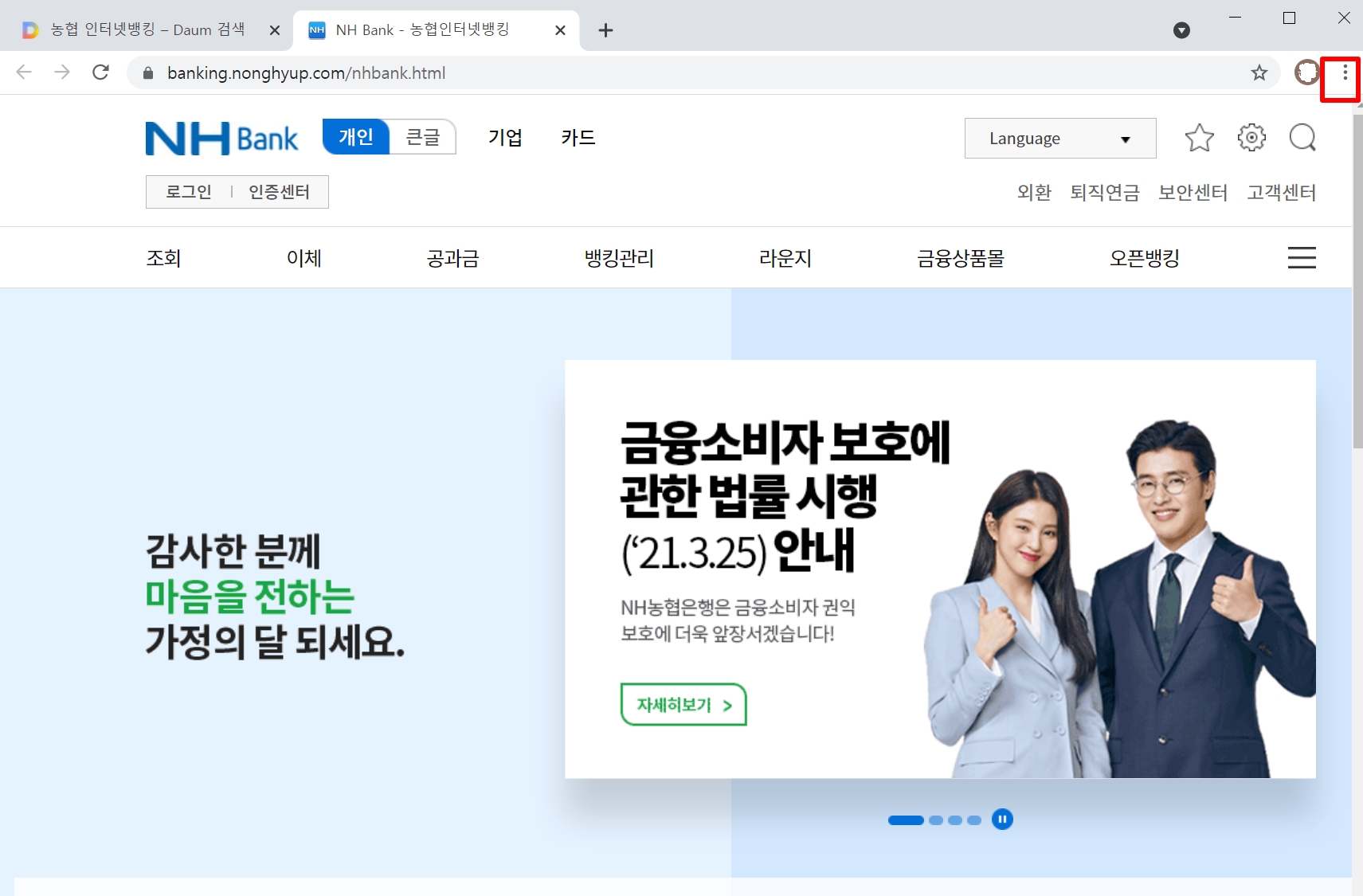 3. "농협 인터넷뱅킹" 사이트에 접속하여 오른쪽 상단에 보시면 "점 3개"를 클릭합니다.