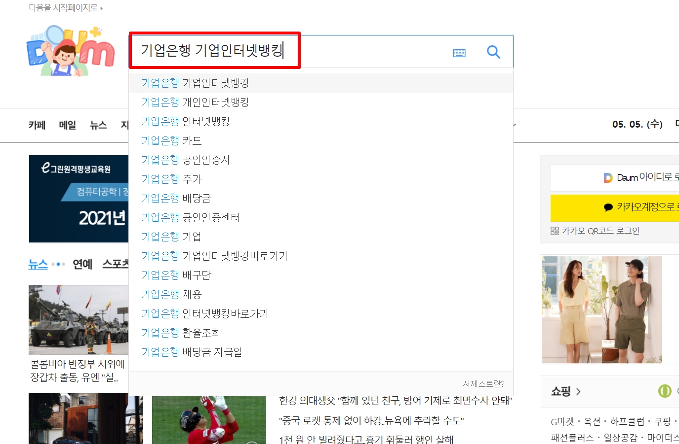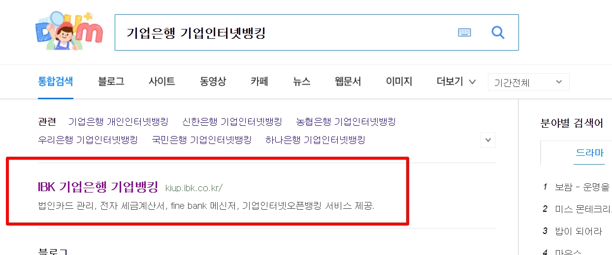 1. 다음(daum) 검색창에 "기업은행 기업인터넷뱅킹"를 검색합니다.