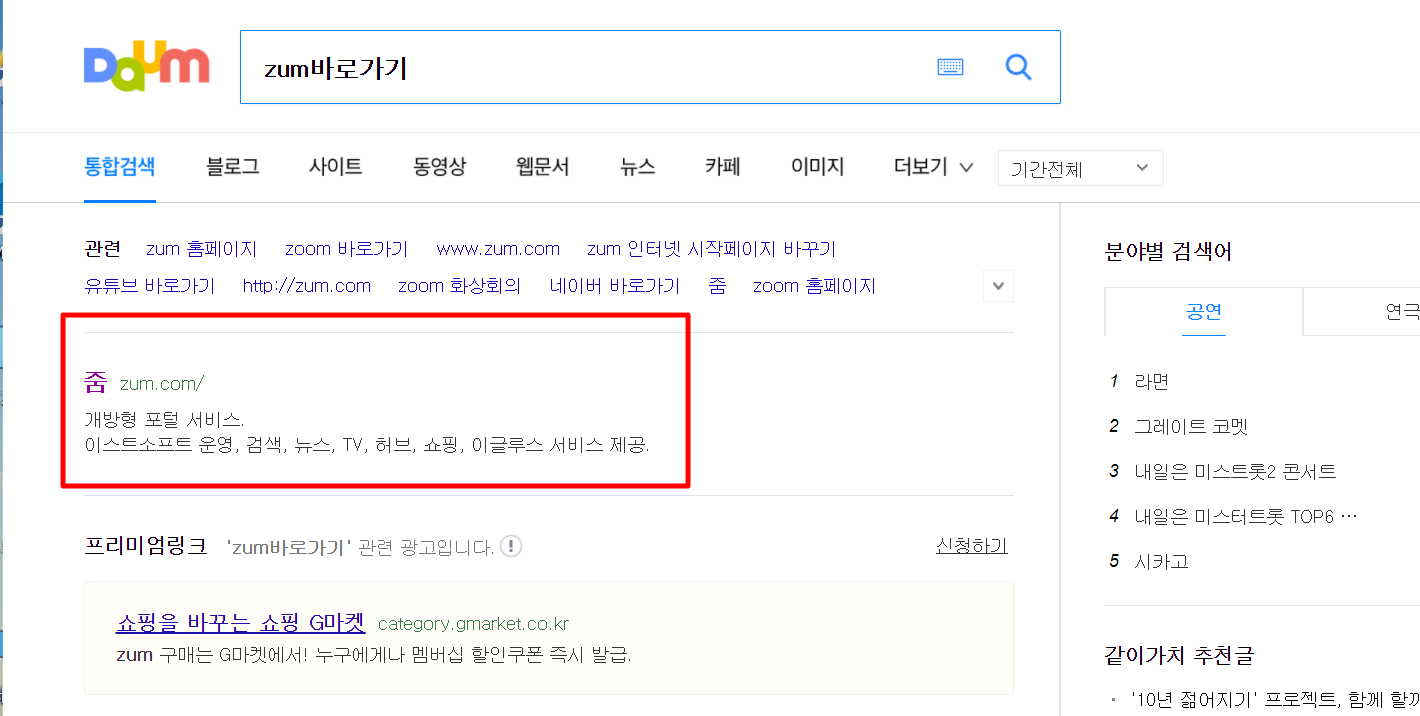 1. 다음(daum)검색창에 "zum 바로가기"를 검색합니다.