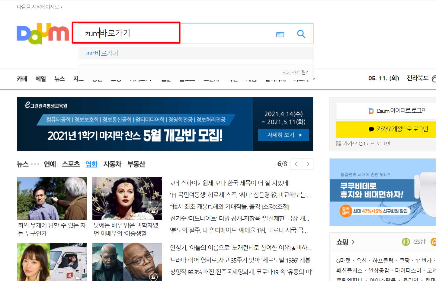 1. 다음(daum)검색창에 "zum 바로가기"를 검색합니다.