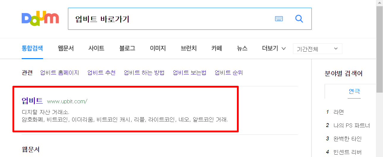 1. 다음(daum)검색창에 "업비트 바로가기"를 검색합니다.