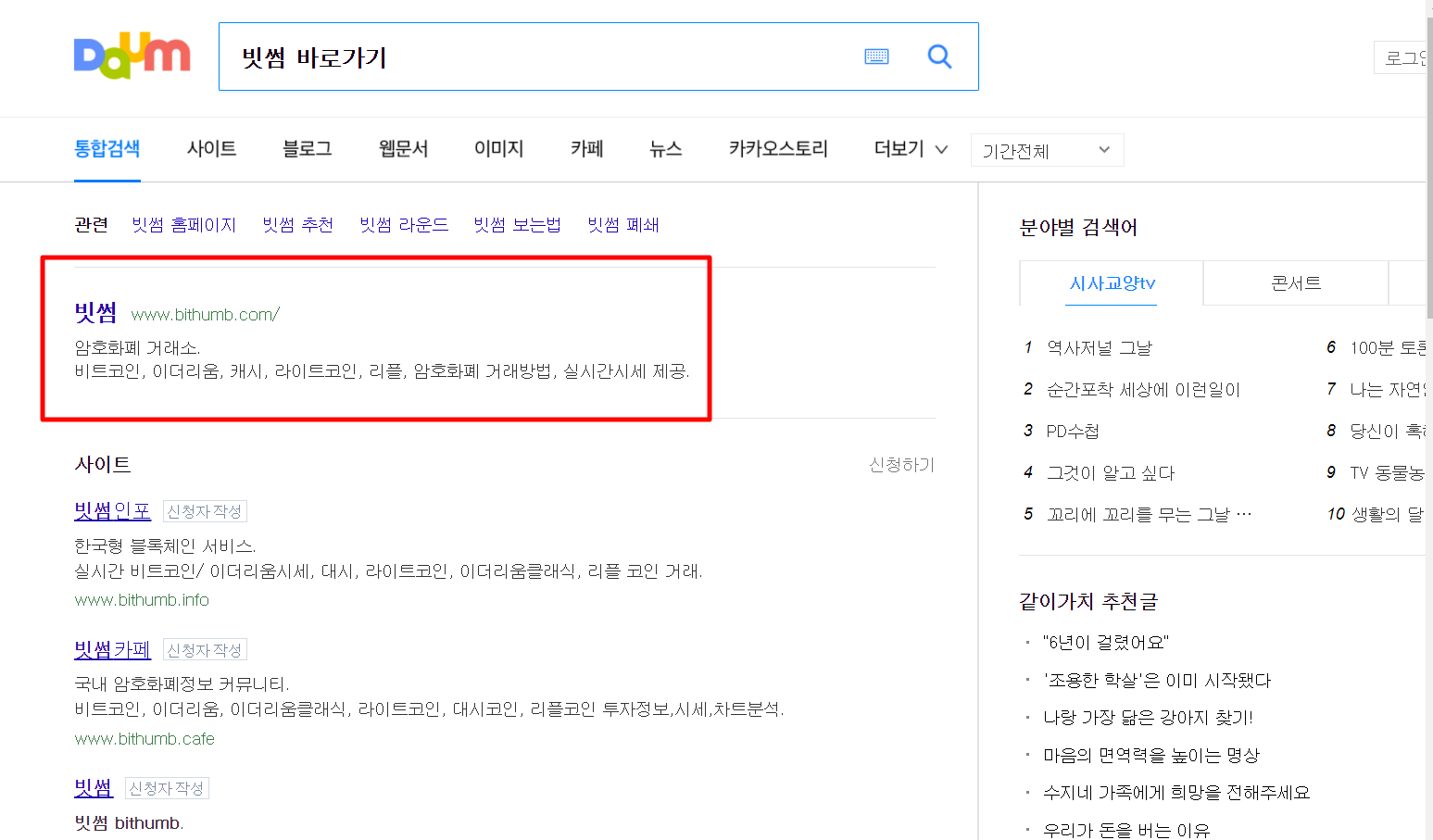 1. 다음(daum)검색창에 "빗썸 바로가기"를 검색합니다.