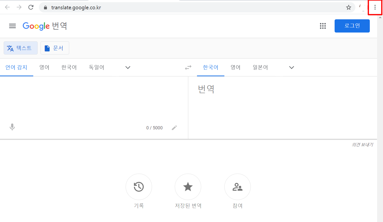 3. "구글번역기" 사이트에 접속하여 오른쪽 상단에 보시면 "점 3개"를 클릭합니다.