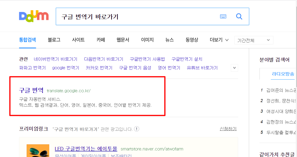 1. 다음(daum)검색창에 "구글번역기 바로가기"를 검색합니다.