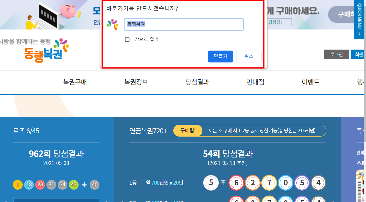 6. 바탕화면에 "동행복권" 아이콘이 뜹니다. 아이콘 누르셔서 동행복권 홈페이지에 접속하시면 로또 당첨번호, 연금복권번호 바로 확인이 되고, 로또와 연금복권도 구매하실 수 있습니다.