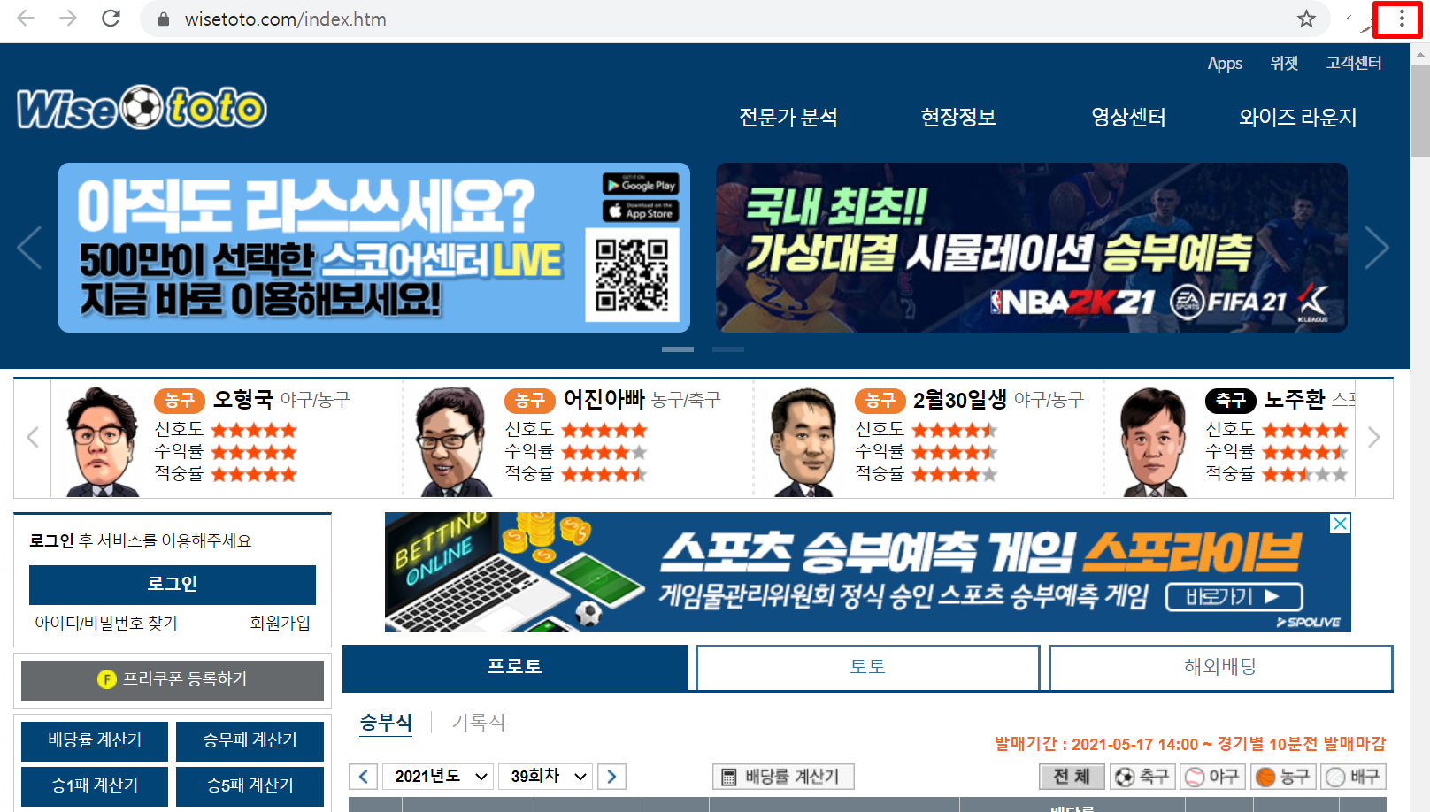 3. "와이즈토토" 사이트에 접속하여 오른쪽 상단에 보시면 "점 3개"를 누릅니다.