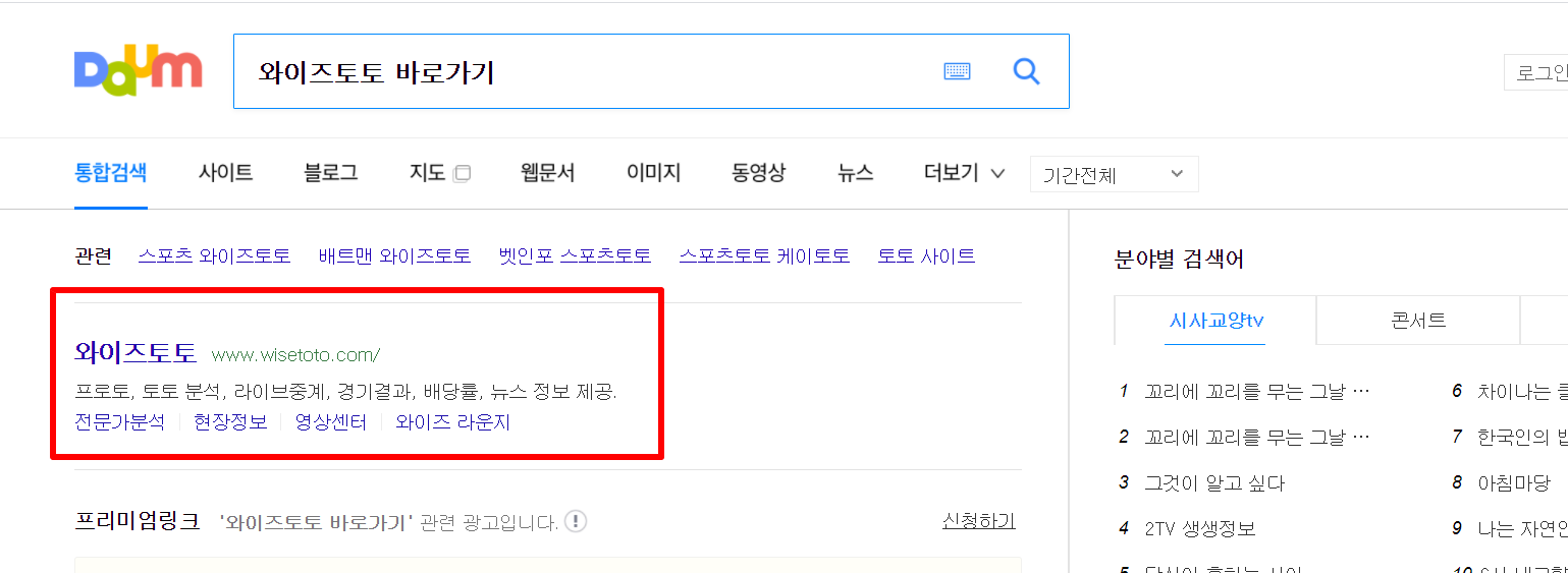 1. 다음(daum)검색창에 "와이즈토토 바로가기"를 검색합니다.
