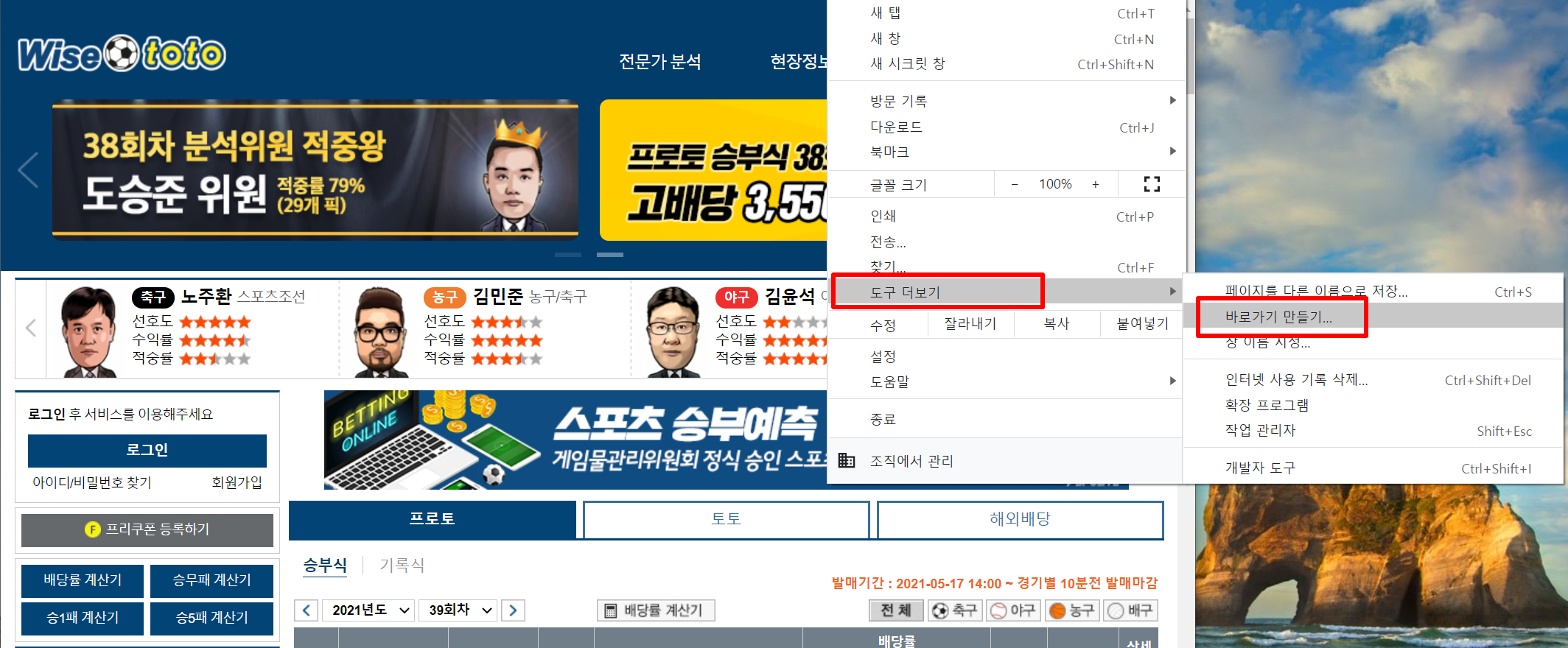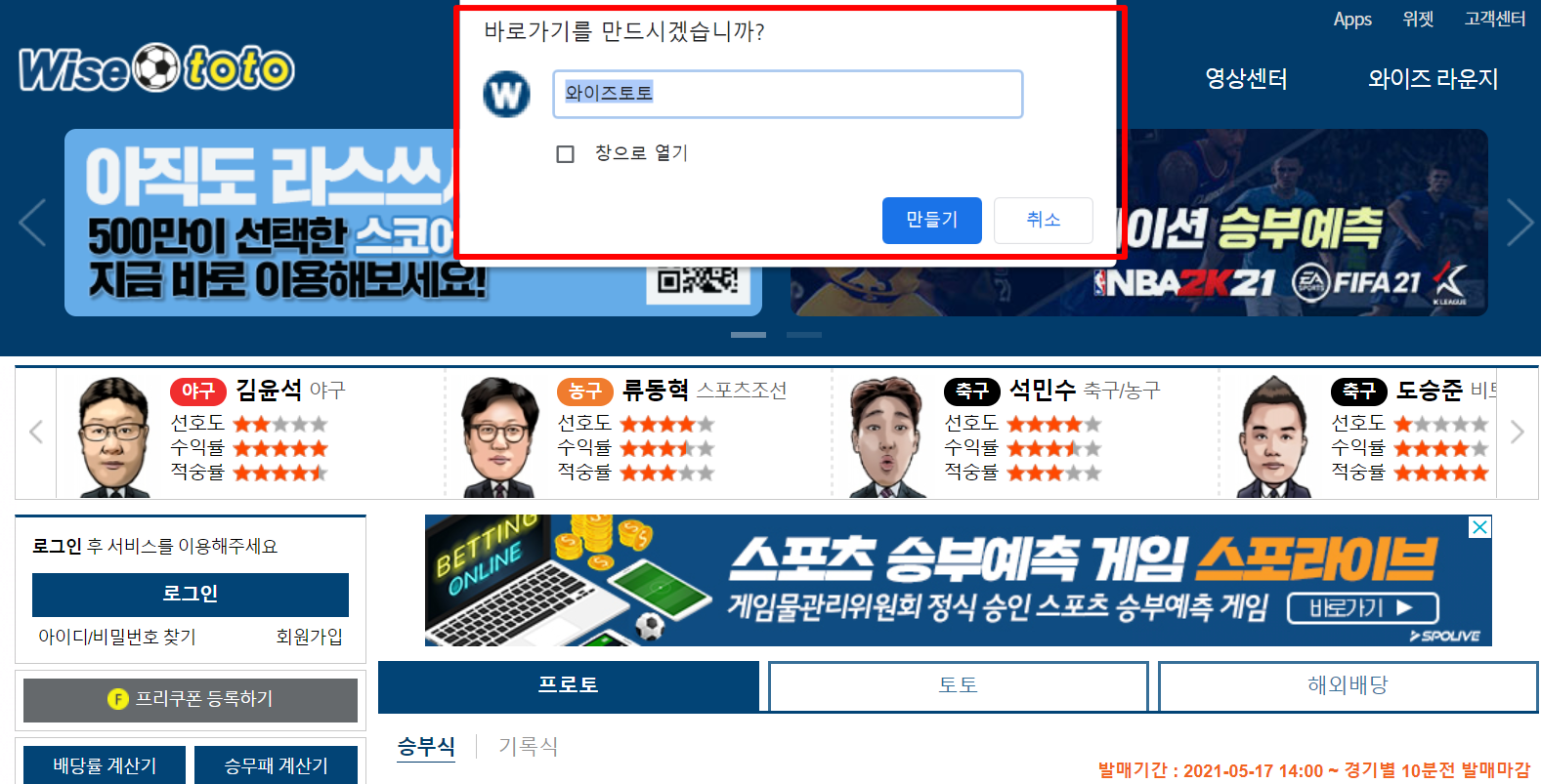 6. 바탕화면에 "와이즈토토" 아이콘이 뜹니다. 아이콘만 누르셔서 와이즈토토 사이트에 바로 접속하셔서 축구, 야구, 농구, 배구, 골프 등 실시간 중계를 이용하실 수 있습니다.