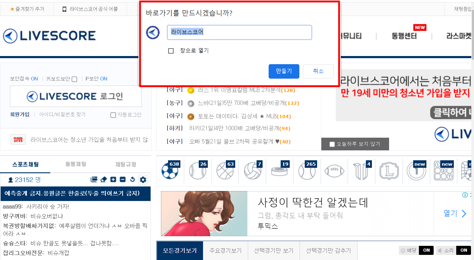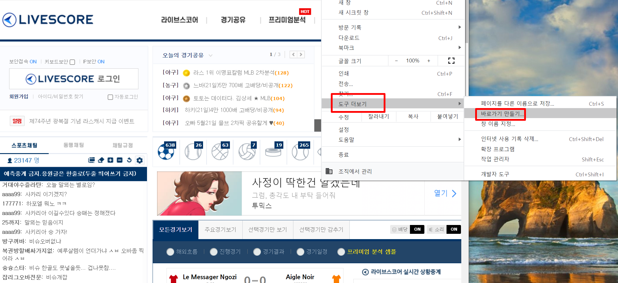 6. 바탕화면에 "라이브스코어" 아이콘이 뜹니다. 아이콘만 누르셔서 라이브스코어 사이트에 바로 접속하셔서 축구, 야구, 농구, 배구, 골프 등 실시간 중계를 보실 수 있습니다. 그리고 토토, 프로토 분석도 이용하실 수 있습니다.