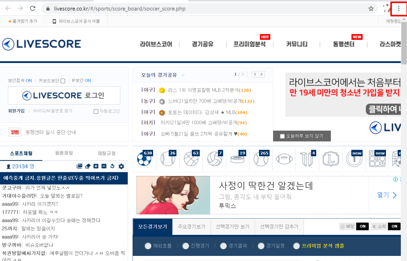 3. "라이브스코어" 사이트에 접속하여 오른쪽 상단에 보시면 "점 3개"를 누릅니다.