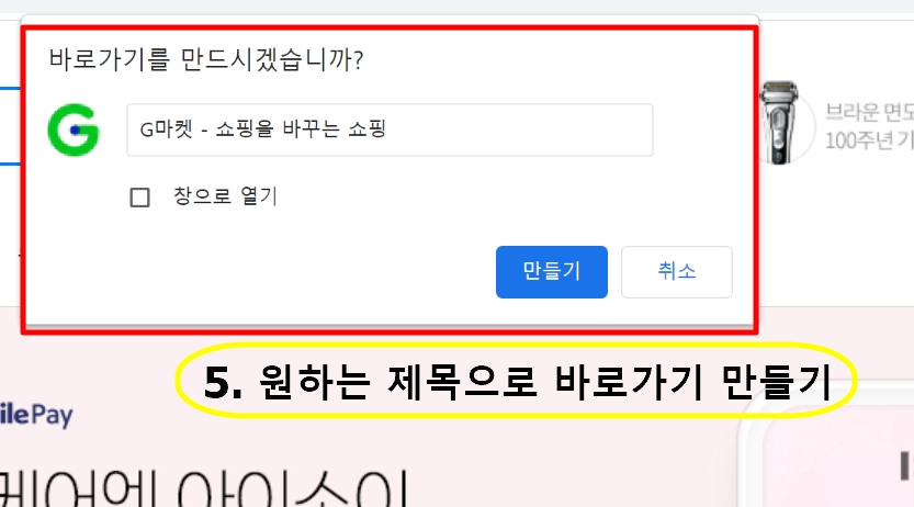 4. 바로가기를 만드시겠습니까? 뜨면 원하시는 제목을 적으신 후 "만들기" 클릭합니다.