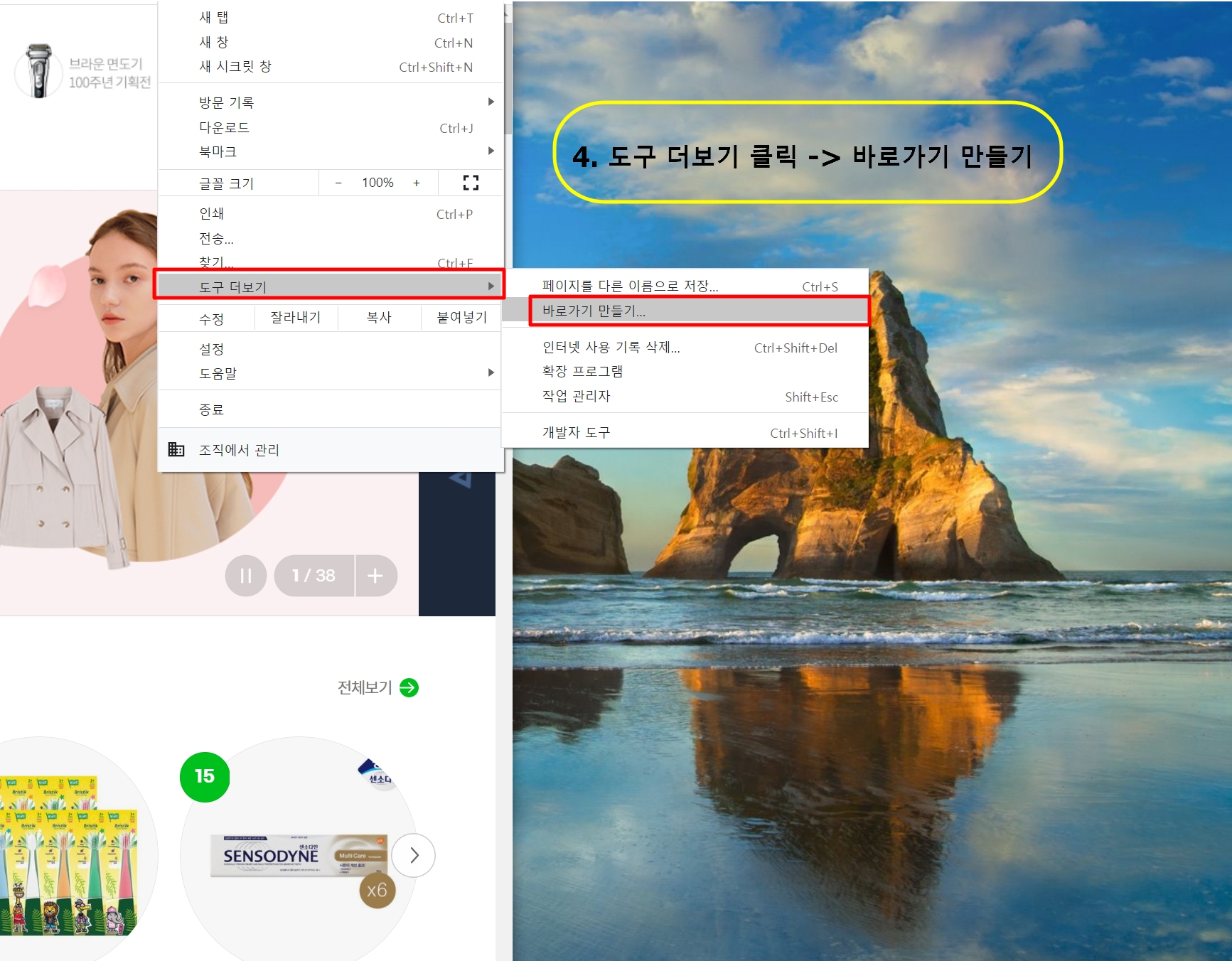 3. "도구 더보기" 클릭 -> "바로가기 만들기" 클릭