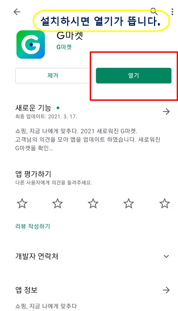 4. "설치" 하시면 "열기"가 뜹니다. 휴대폰 바탕화면에서 지마켓 아이콘이 뜨시면 바로 클릭하셔서 지마켓 이용하시면 됩니다.