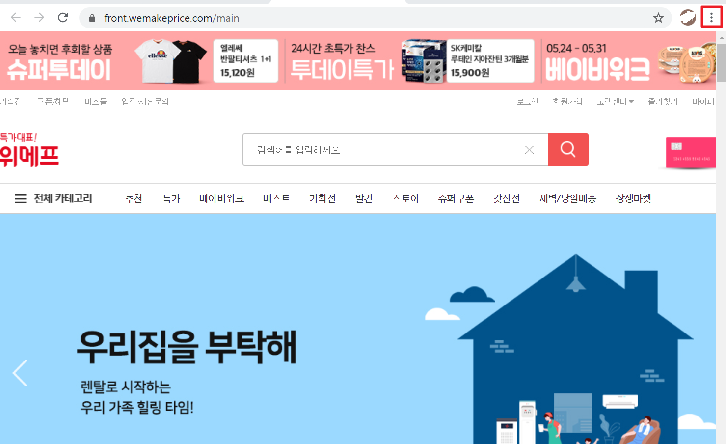 3. "위메프" 사이트에 접속하여 오른쪽 상단에 보시면 "점 3개"를 누릅니다.
