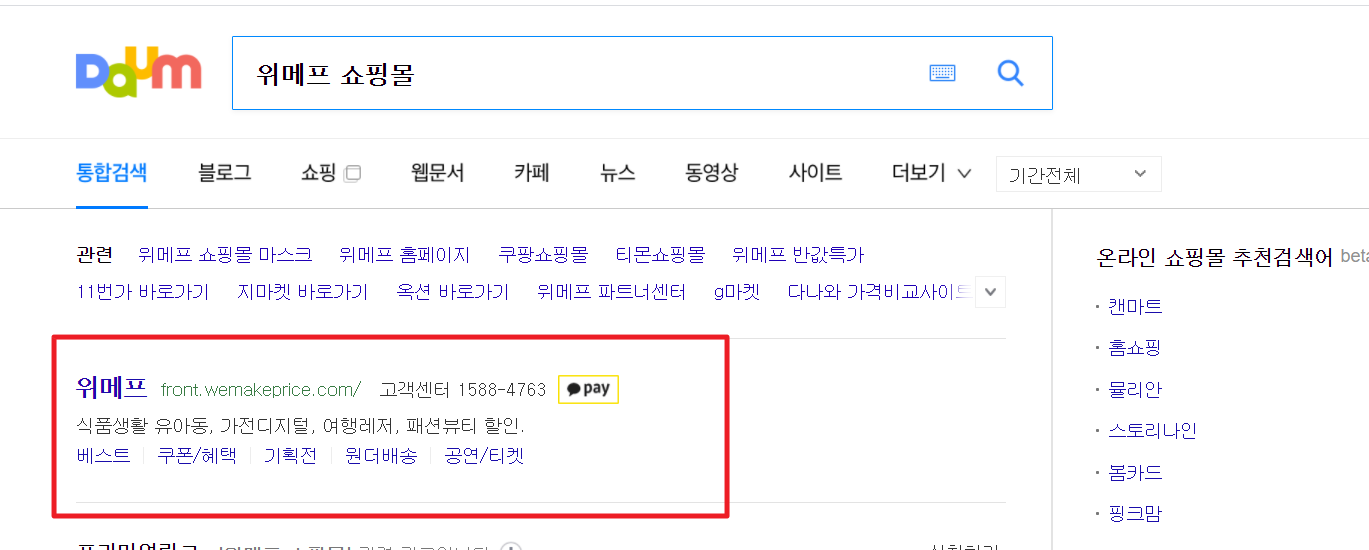 1. 다음(daum)검색창에 "위메프 쇼핑몰"을 검색합니다.