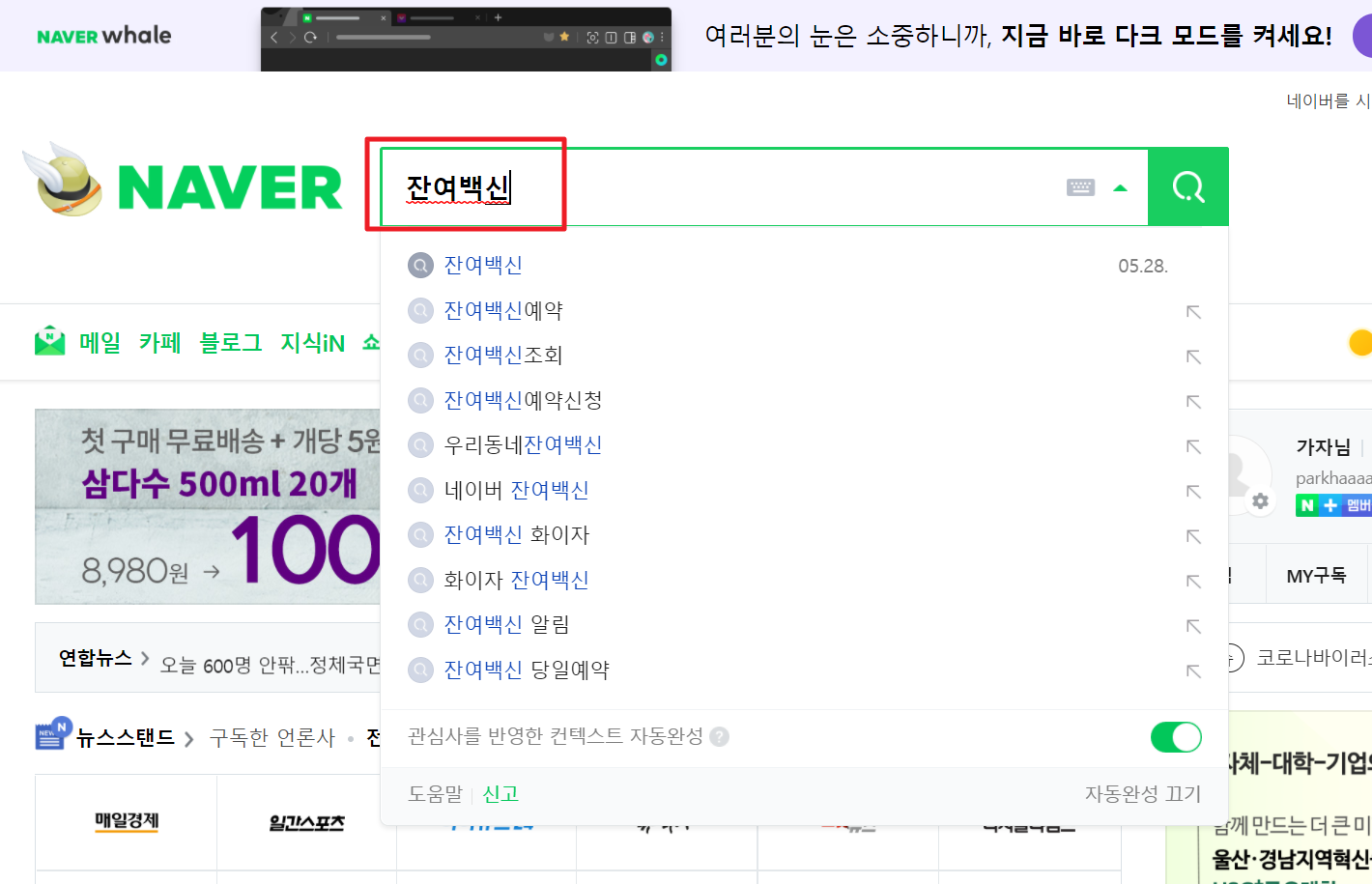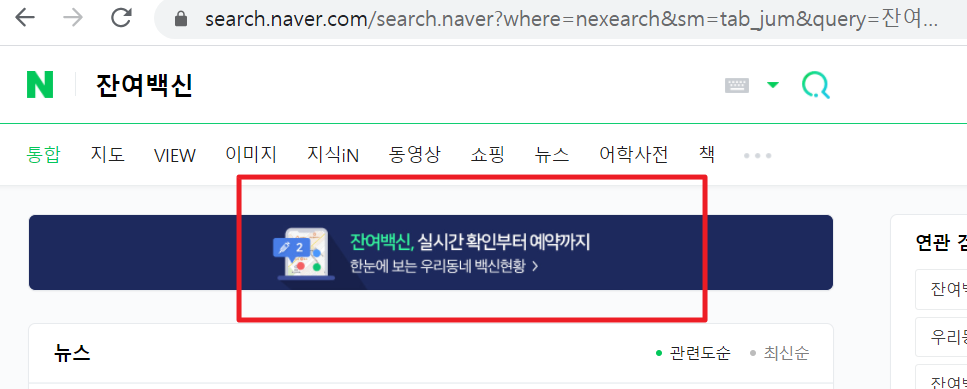 1. 네이버(naver) 검책창에 "잔여백신" 검색합니다.
