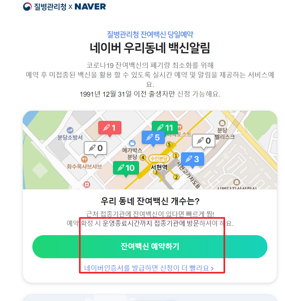3. 들어가면 질병관리청 X NAVER 문구와 함께 "네이버 우리동네 백신알림" 홈페이지가 뜹니다. 아래의 "잔여백신 예약하기"를 클릭합니다.