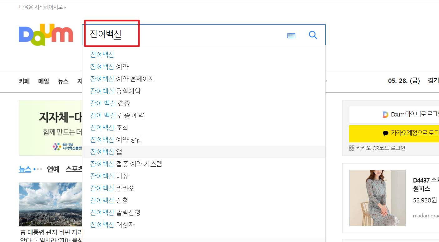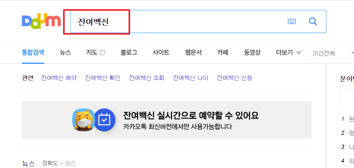 1. 다음(daum)검색창에 "잔여백신"을 검색합니다.