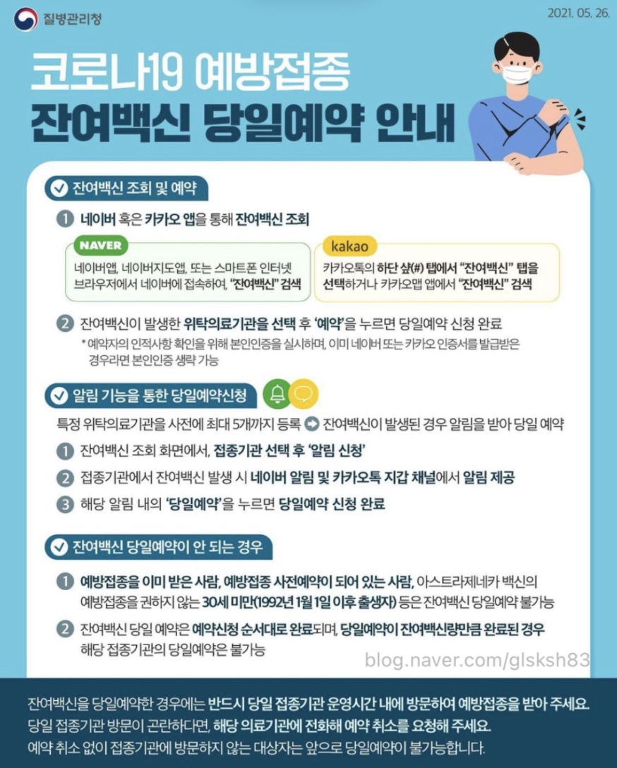 잔여백신은 의료기관에서 긴급하게 접종대상자를 찾아서 접종할 수 있습니다. 다만, 의료기관에서 직접 적절한 대상자를 찾지 못할 경우를 대비하여 인근 접종기관에서 아스트라제네카 예방접종을 원하는 국민이 네이버, 다음을 통해 빠르고 간편하게 예약한 후, 당일 인근 접종기관에 바로 방문하여 접종할 수 있도록 서비스화하였습니다. 이를 당일 예약이라고 합니다.