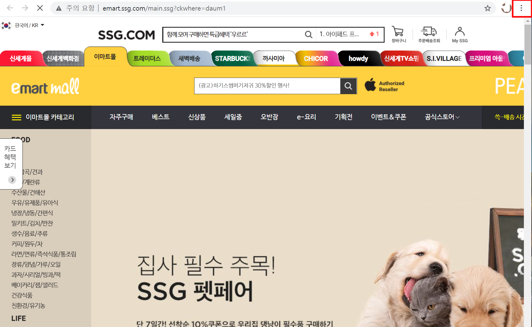3. "이마트몰" 사이트에 접속하여 오른쪽 상단에 보시면 "점 3개"를 누릅니다.