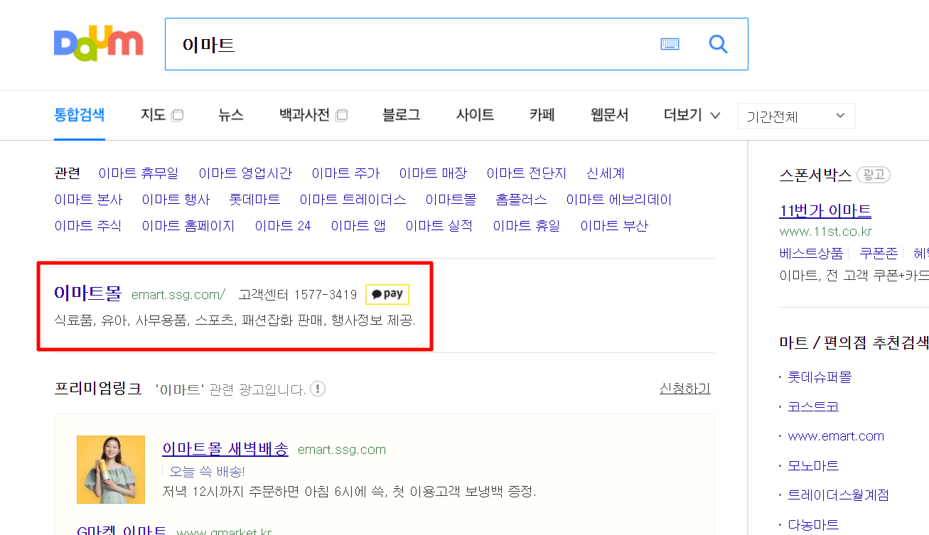 1. 다음(daum)검색창에 "이마트"를 검색합니다.