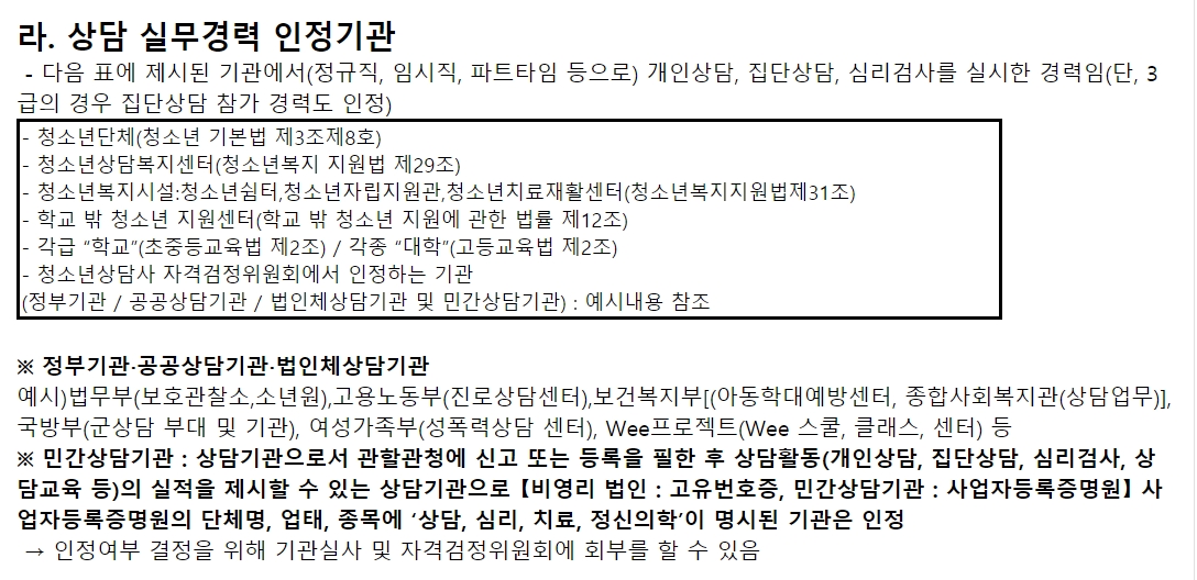 청소년상담사 응시 등급별 상담 실무경력 인정기준입니다.