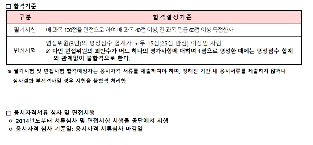 필기시험: 매 과목 100점 만점으로 하여 과목당 40점 이상, 전 과목 평균 60점 이상 득점 한자