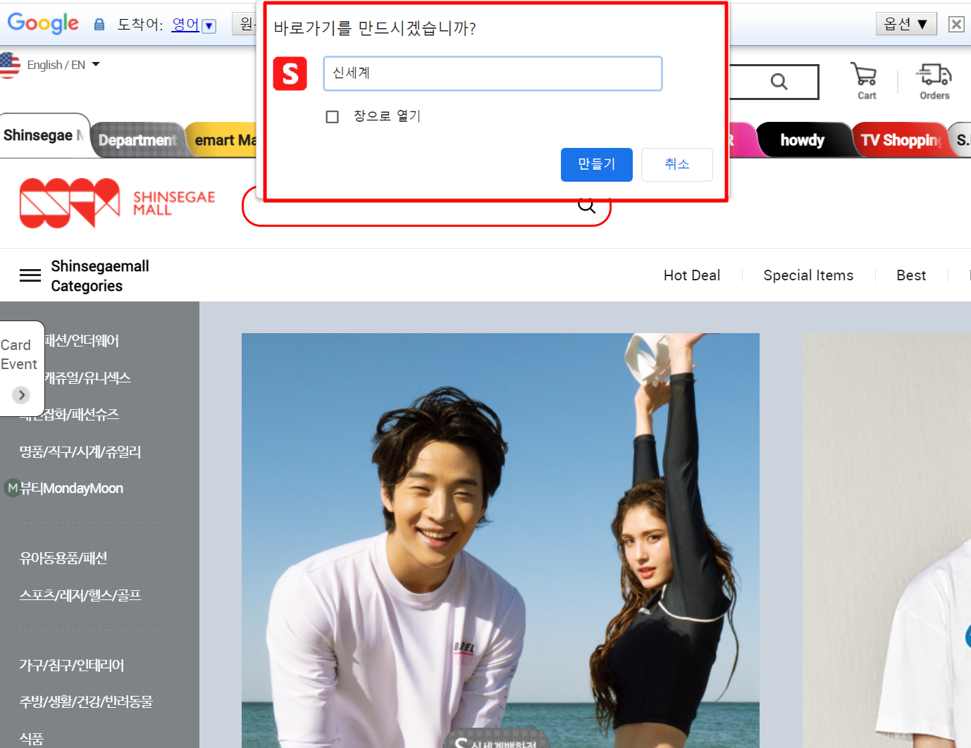 6. 바탕화면에 "신세계몰" 아이콘이 뜹니다. 아이콘만 누르셔서 신세계몰 접속하실 수 있습니다. 컴퓨터, 전자, 사무, 가정, 패션, 미용, 어린이, 식품, 선물용품 판매 등 종합쇼핑몰입니다.