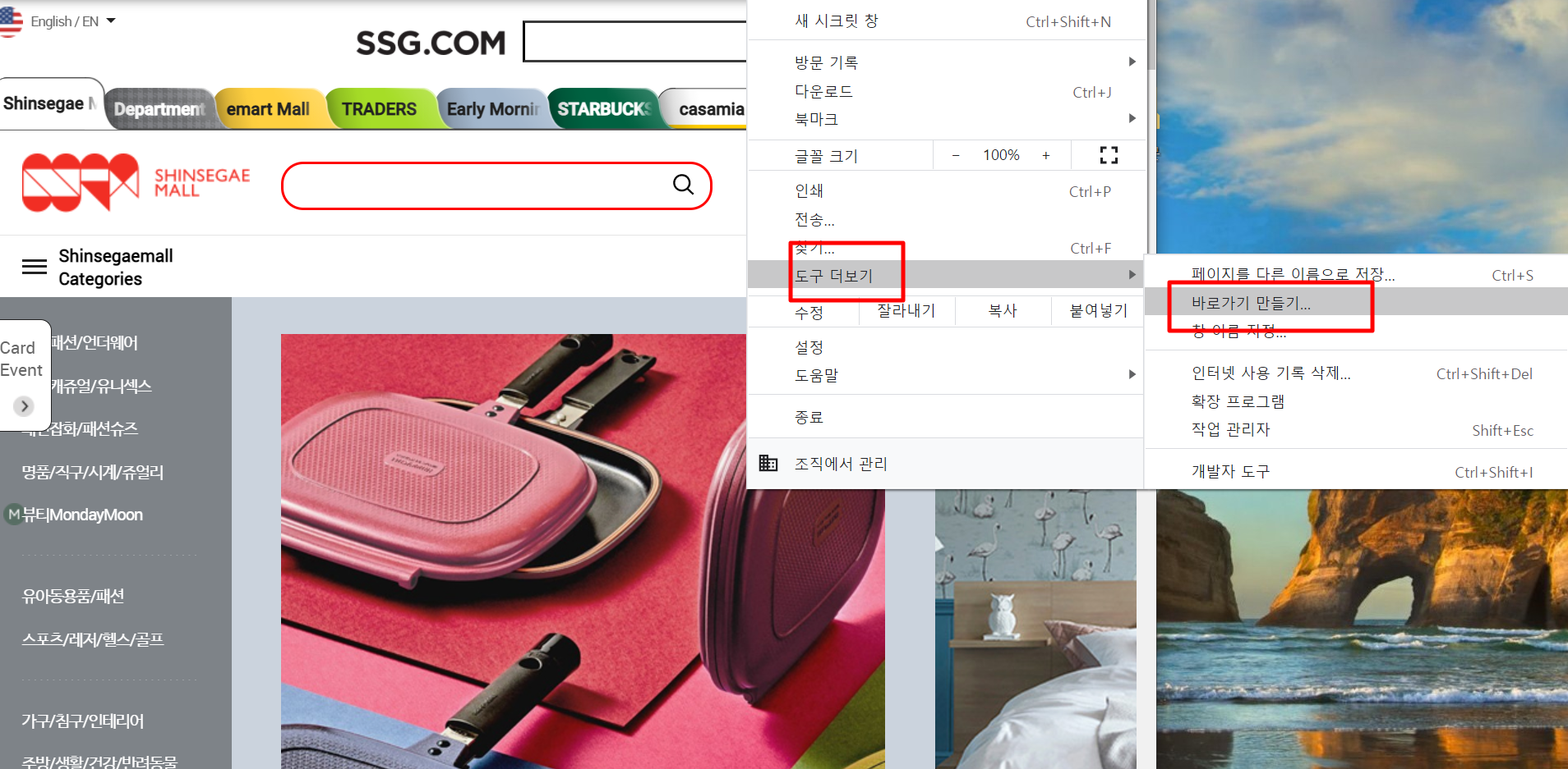4. "도구 더보기" - "바로가기 만들기"를 누릅니다.