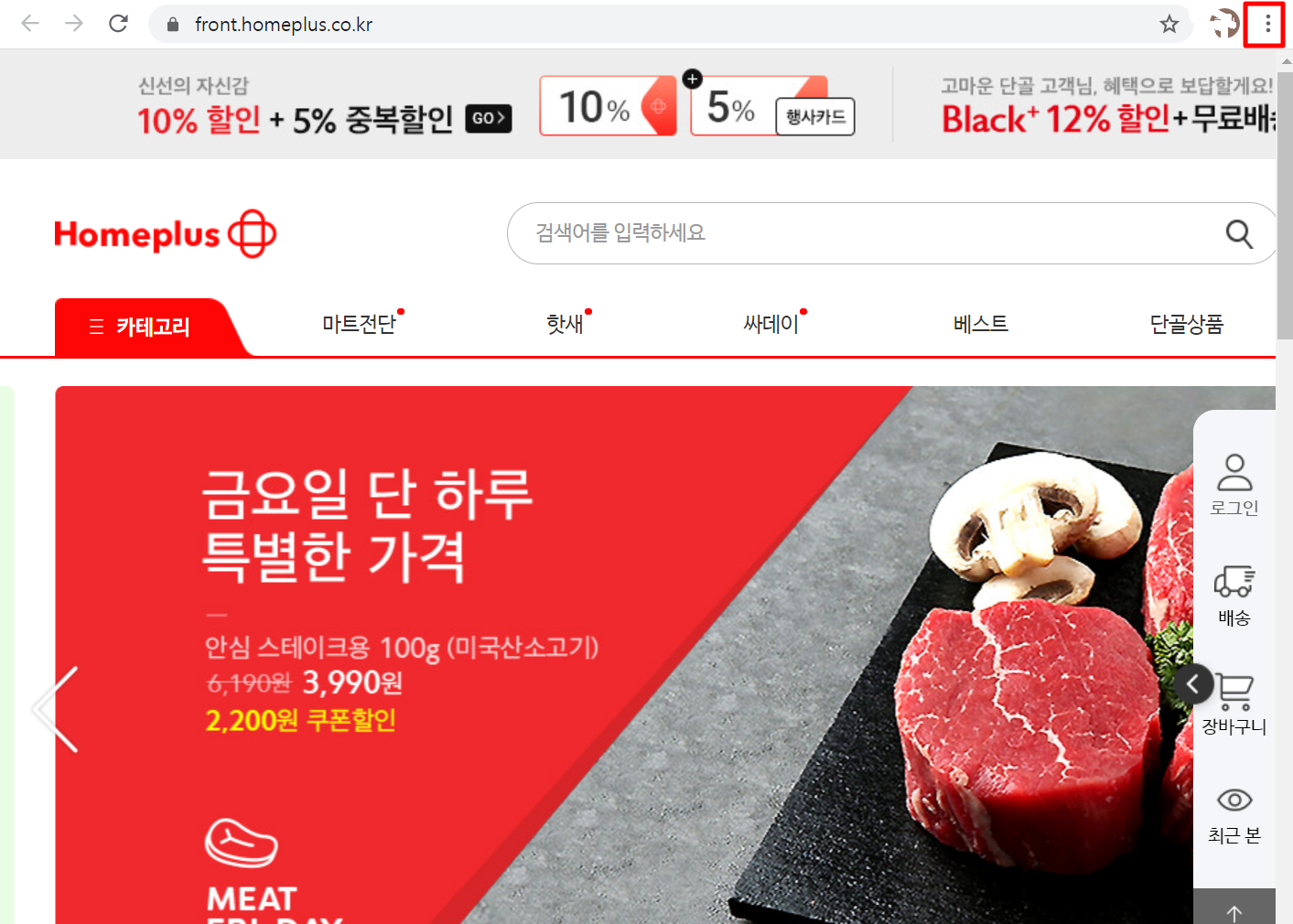 3. "홈플러스" 사이트에 접속하여 오른쪽 상단에 보시면 "점 3개"를 누릅니다.