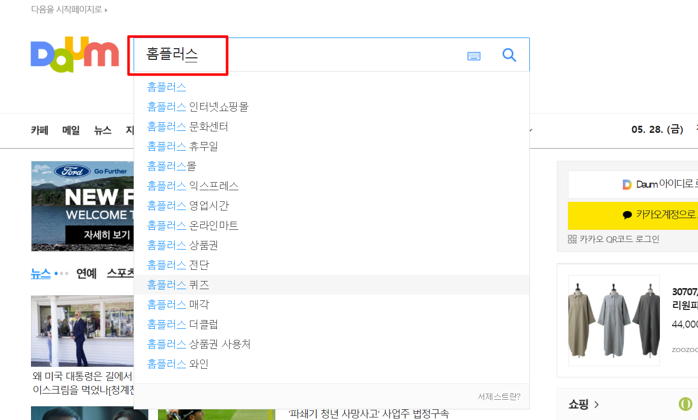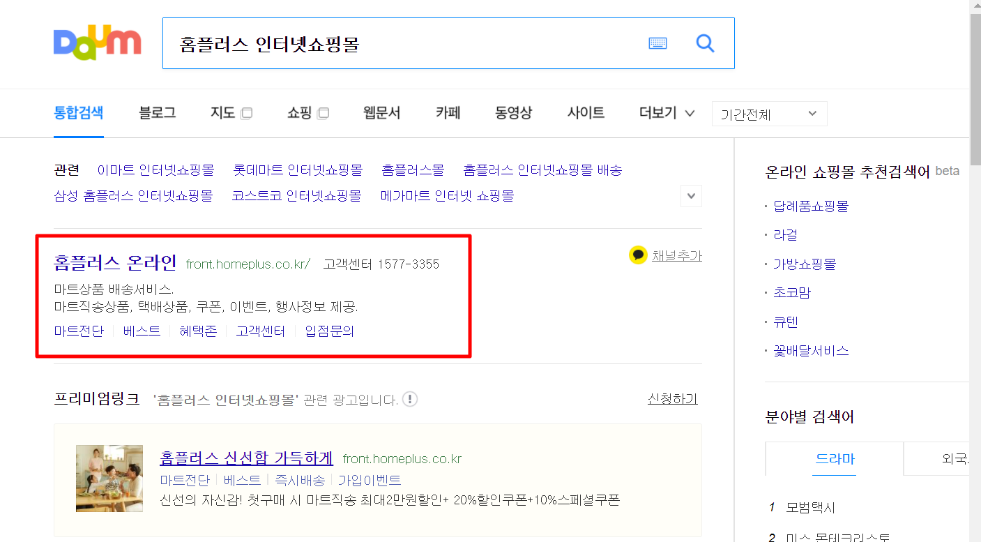 1. 다음(daum)검색창에 "홈플러스"를 검색합니다.