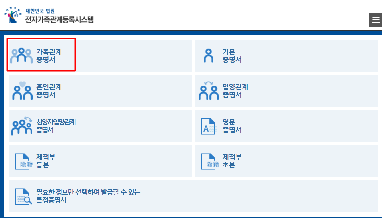 3. "대한민국 법원 전자가족관계등록 시스템" 사이트에 접속하여 "가족관계증명서" 항목을 누릅니다.