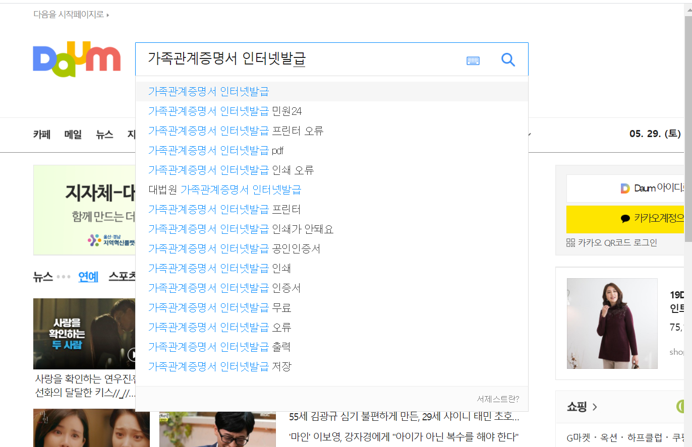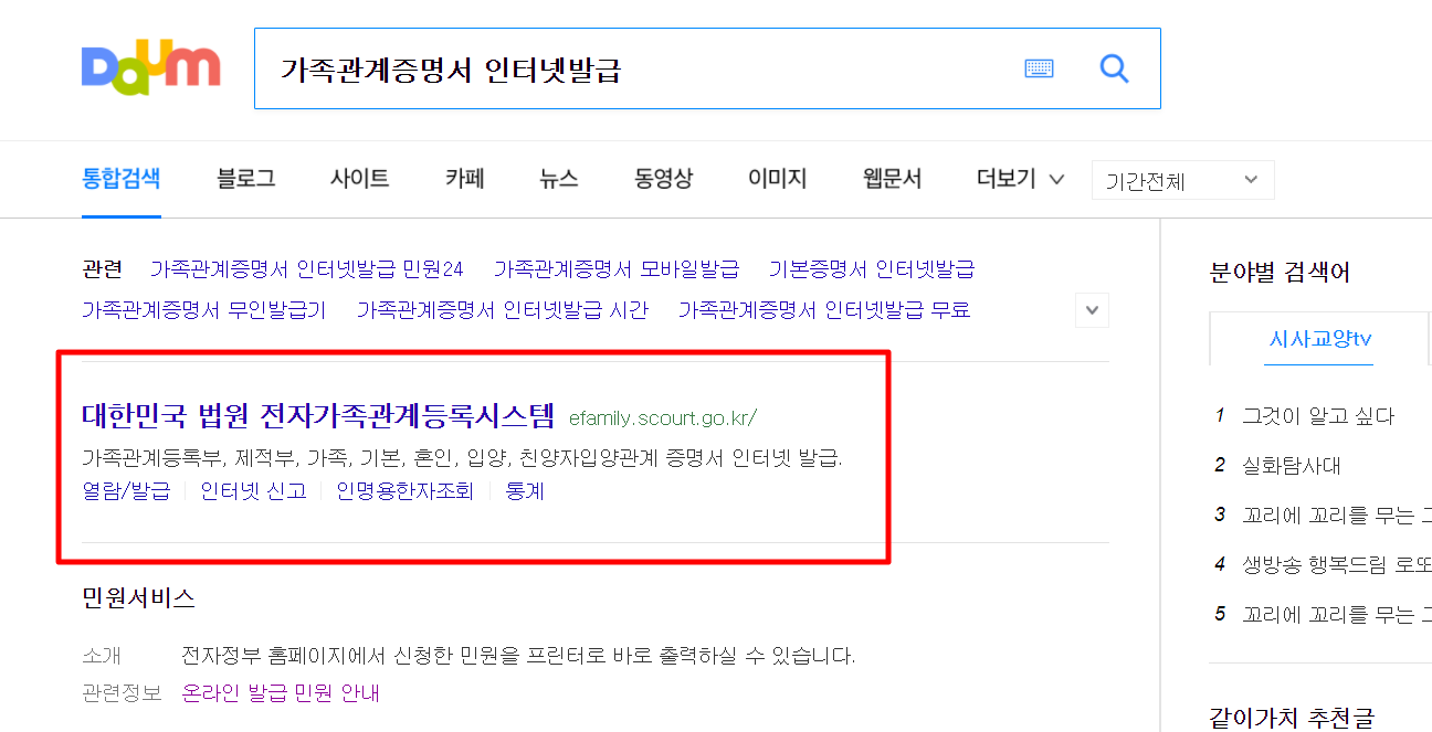 1. 다음(daum) 검색창에 "가족관계증명서 인터넷 발급"를 검색합니다.