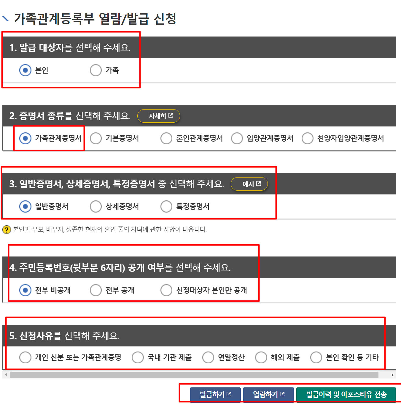 6. "가족관계등록부 열람, 발급 신청"에 대하여 여러 항목이 뜹니다. 각 항목에 맞는 곳을 선택하셔서 제일 하단의 "발급하기, 열람하기, 발급이력 및 아포스티유 전송"을 누릅니다.
